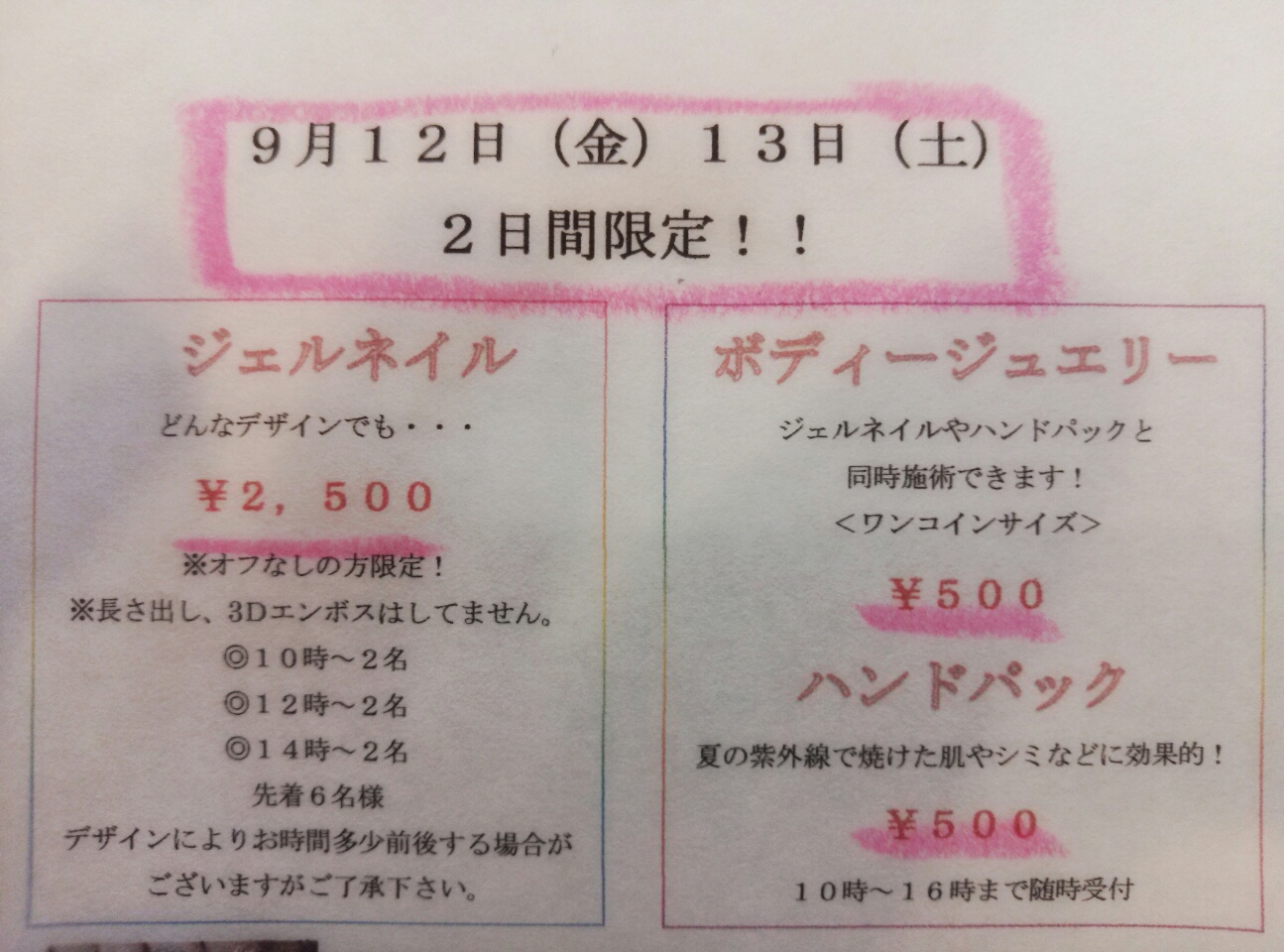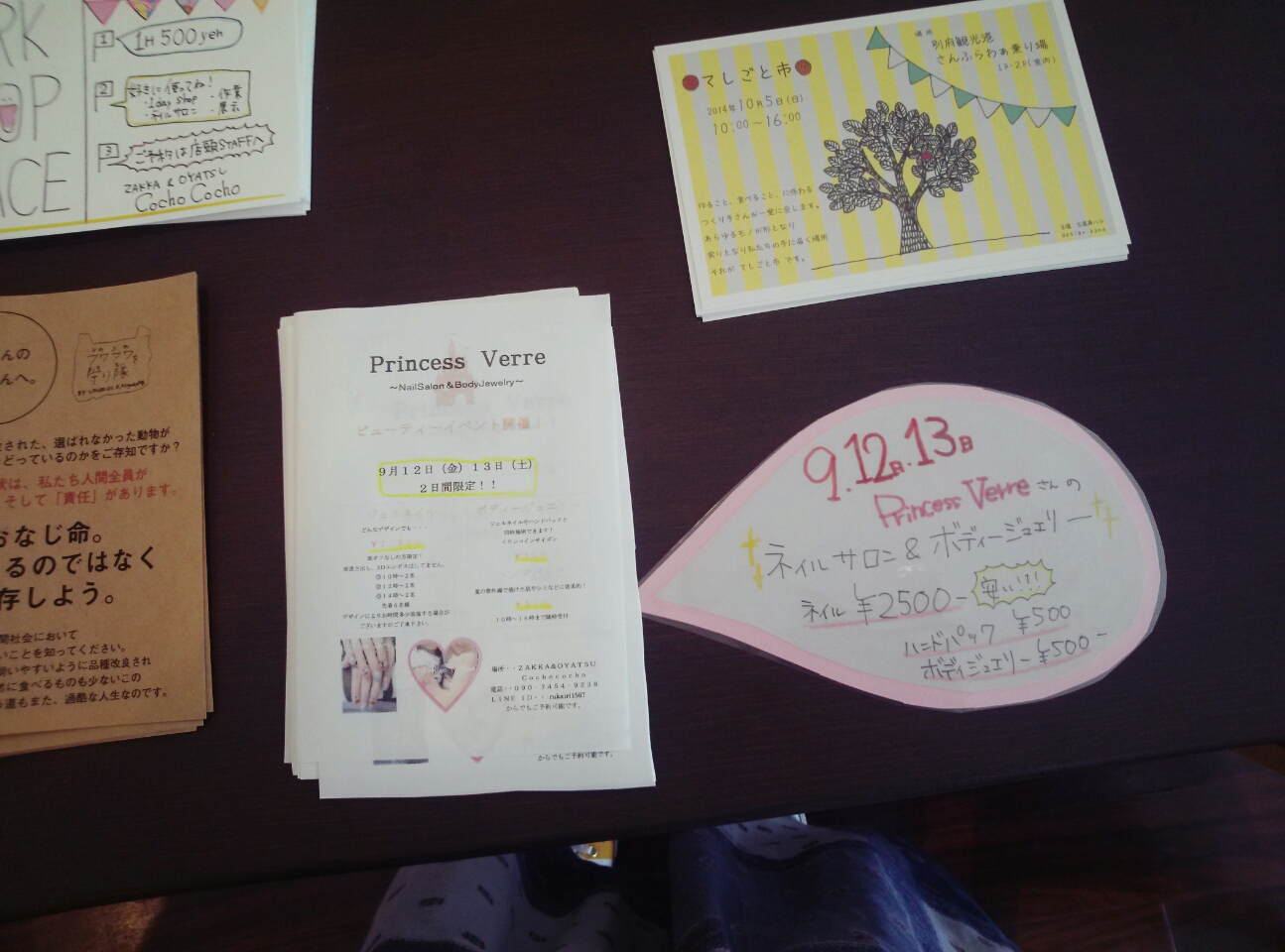 こんにちわ! ZAKKA&OYATSU CochoCochoです 9月の頭が月曜日から始まるってなんだかすごいですね! そんなどうでもいいことは さておき。 色々皆さんにお知らせする事があります まずは、、、、 9月12日13日の二日間 ワークショップスペースにて ネイルサロンのPrincessVerreさんが来ていただけます ジェルネイル 10:00~(2名) 12:00~(2名) 14:00~(2名) お好きなデザイン ¥2500- →めっちゃ安くしてもらいました! 普通ネイルって安くても4000円はしますよね? あらかじめオフしてきてくださいとのことです。 ハンドパック 10:00~16:00 シミや日焼けに効果的! ¥500- ボディジュエリー 10:00~16:00 ワンコインサイズ おしゃれや記念に ¥500- Princess Verreさんのホームページ こちら 二日間限定でしてくれます。 予約は メール【zakka.cocho2@gmail.com】、店頭等まで ちなみに、わかってる方が多いとおもいますが ワークショップでします 9月14日から9月24日まで ZAKKA&OYATSU CochoCocho 1周年記念セール ZAKKA&OYATSU CochoCochoが1歳になります! ここまで続けられたのも、皆様のおかげです! そこで、感謝の気持ちと これからも宜しくお願いします! という気持ちをこめて 手作り雑貨以外の雑貨 20%off!! 9月14日からですからね! お間違いなく! あ! 土曜日の方の ポーセラーツワークショップの風景を少し。 では、本日も宜しくお願いします! |