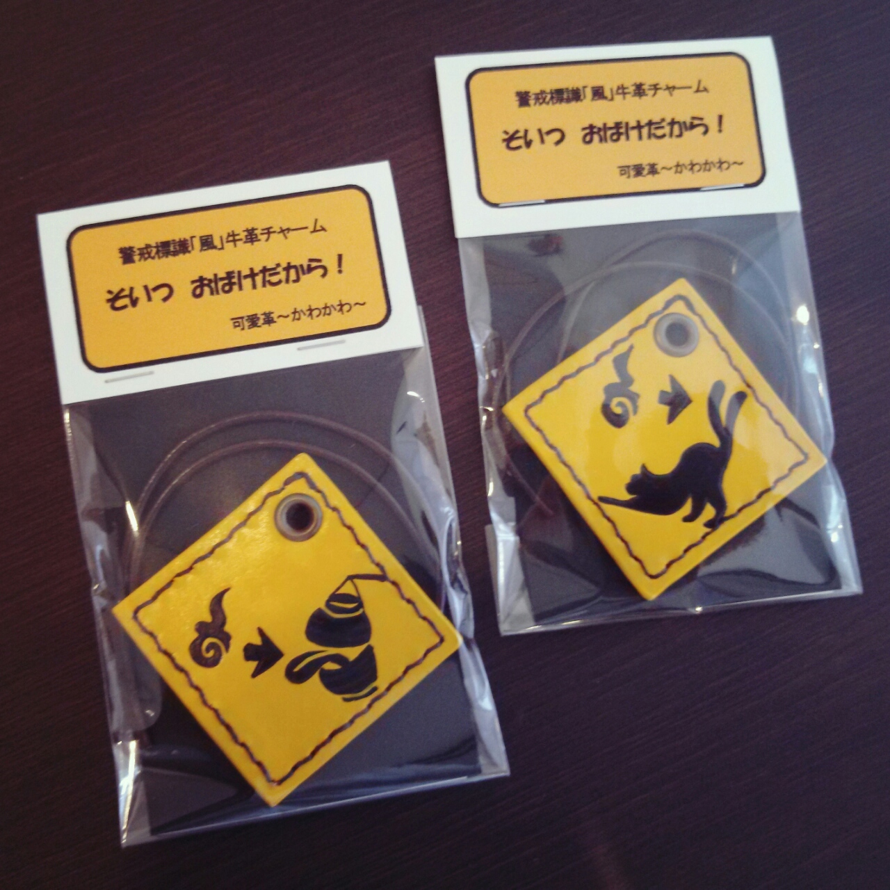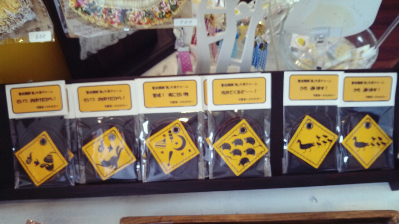 黄色い標識みたいな 、バックチャームを作ってくださいました。