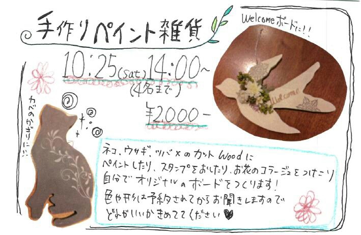 こんにちわ! ZAKKA&OYATSU CochoCochoです。 色々していたら ブログ更新がこんな時間になってしまいました。 こんにちわ!じゃなくてこんばんわ!の時間ですね!w 金木犀がいいにおいですね(*´∀`*) ずーっと秋だったらいいのに! まずは、手作り雑貨さんの新作のお知らせから(∩^o^)⊃━☆゚ 名古屋から毎度送って来ていただいている はんこ堂さんから たくさん新作はいりました 蜂さん 照れてる Thank you! はんこ堂さんは毎回毎回可愛いはんこを送ってくださいます. ゜*。:゜ はんこ堂さんのブログは こちら(∩・ω・)⊃━☆゚.*・。 10月のワークショップのお知らせです。 既に2つ入ってます! まずは 【チャームネックレス教室】 日時 10月16日19:00~ 10月19日11:00~#14:00~ 定員3名 レッスン代1300円 たくさんのビーズやチャームのなかから好きなものを選んでネックレスにします。 こうゆうのって、すぐ作れそうだけど、案外材料を揃えたりするのが面倒だったりしますよねw ピン曲げなど、独学だとわかりずらいものもおしえてくれます。 プレゼントや思い出作りにいいと思います。 【ペイント雑貨教室】 日時 10月25日14:00~ 定員4名 レッスン代2500円 猫やうさぎ、ツバメの形をしたボードに、ペイントしたり、スタンプをおしたらや、お花のコラージュをしたりします。 トールペイントというと、開口一番に「私は絵が苦手だから、、、」という方がいますが、今回は初心者向け! 事前に下地の色を塗ってくれます。(お好きな色をお申し付けください) スタンプやお花のコラージュをつけるので、好きなように組み合わせたりするだけ! 可愛い壁掛けができます! この教室の先生は別府で活動されています。直接別府の教室に行かれてもいいですね! 教室のブログは こちら(∩・ω・)⊃━☆゚.*・。 毎月25日発売の 月刊シティ情報 おおいた(CJO)さんに今月も載せて貰っています! P69! CJOに載せている商品を紹介します。 まず 1番上の craft kazさんより 【ピアノハンマーキーホルダー】¥950- ピアノの音はこいつによってなっています。 (画像使いました許してください) これは、ピアノの廃棄のハンマー部分を切り取ってキーホルダーにしたもの。 一台分しかつくれないので、かなり貴重 次に紹介するのは 【BOOK DARTS】 こちらも以前ブログで紹介したかもしれませんが、 もう一度紹介します。 もう一度紹介するってことは 大事だからですね! こうゆうふうに しおりや、付箋変わりにつかいます。 色が二種類あってどちらもハイセンス 最後に今話題の 【ポーセラーツ】 ポーセラーツとは、白磁器に転写紙を貼ってつくる事です。 うちで取り扱うポーセラーツ食器は、教室の先生をできり資格を持った方々なので、かなり高度なテクニックによって作られた食器ばかり CJOに載せたのは 可愛い感じの食器ですが うちには こうゆう ダイエット茶碗もありますw 可愛いでしょ? 普段、たくさん食べてしまう人にオススメ!って私か!1番要るのは私か! 今話題の ポーセラーツしてみたい!ってなりましたか? ZAKKA&OYATSU CochoCochoでは、2名のポーセラーツ作家さんがいます。 ぜひそちらに行って習うのをオススメします。 作家さんのブログを紹介しておきますね 庄内付近のLachouchouさん http://s.ameblo.jp/saori-815/ わさだ付近のBlairさん http://s.ameblo.jp/nikochan1222/ ポーセラーツは定期的にZAKKA&OYATSU CochoCochoでもワークショップを開いています。 次にある際はぜひ参加してくださいね\(^o^)/ さあ!やっと終盤です。 先日、福岡のイベント 【ひみつきち】に参加してきました。 同世代の作家さんでする、アパートの1室にて小さなイベント。 でも、1人1人が素晴らしかった やはり同世代という事でお互い刺激しあえるいい空間となりました Instagramはじめました! アカウント名 zakka.cocho2です。 フォローお願いします! またtumblerもはじめてみました! アカウント名 zakkacocho2 どちらも まだまだ勉強が足りませんが、 どちらも 更新できたらな。 と思います! 10月のお休み 1.8.23 |